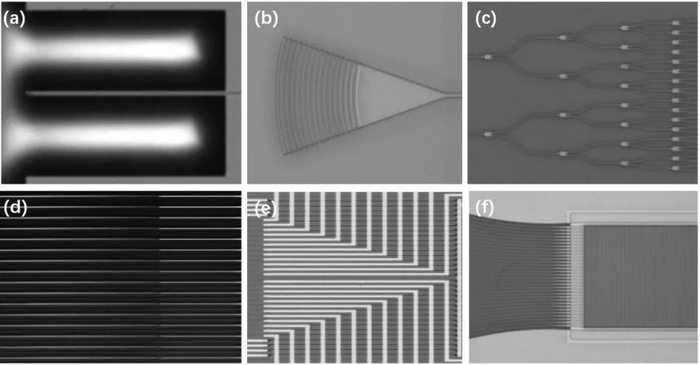 圖2. (a)端面耦合器;(b)光柵耦合器;(c)級(jí)聯(lián)的MMI;(d)SiN-Si雙層耦合結(jié)構(gòu);(e)熱光調(diào)相器;(f)光學(xué)天線
