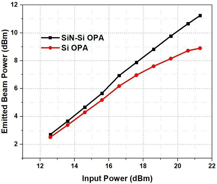 圖3. SiN-Si OPA芯片、Si OPA芯片輸出功率與輸入功率的關(guān)系
