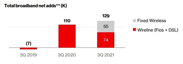 Verizon在第三季度新增的5.5萬FWA用戶約占該期間新增的12.9萬寬帶用戶的42%。