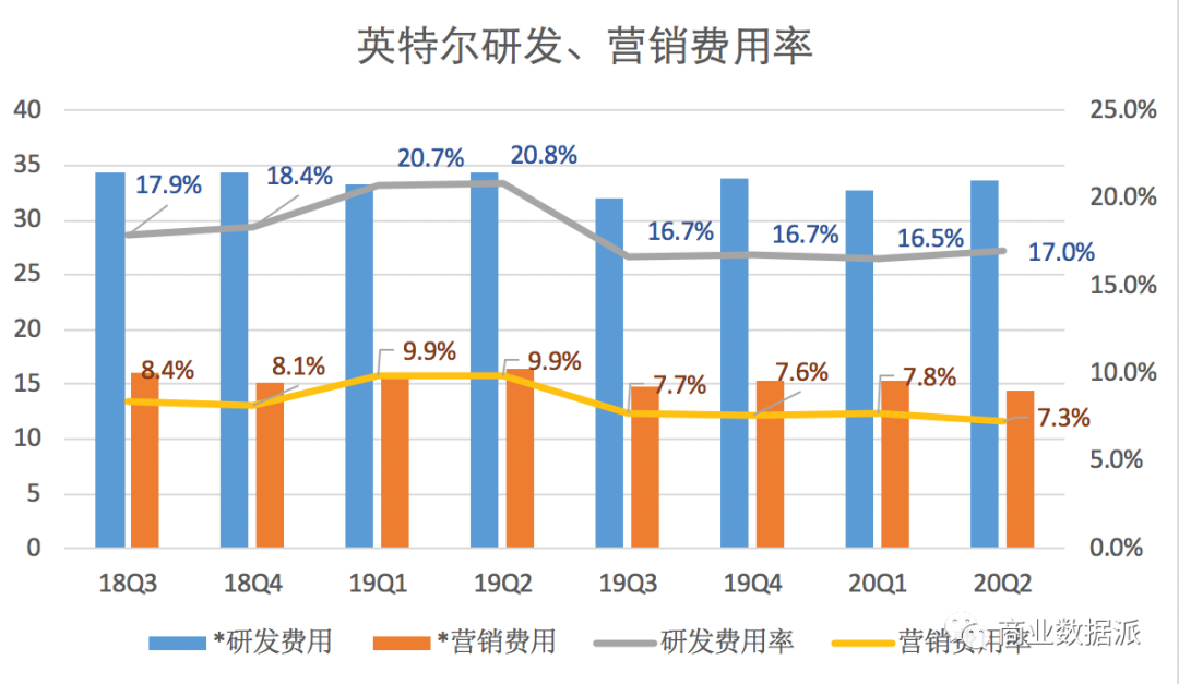 在費(fèi)用支出方面,隨著營收的水漲船高,英特爾并沒有相應(yīng)擴(kuò)大研發(fā)、營銷費(fèi)用的投入,季度研發(fā)費(fèi)用維持在33億元左右的水平,營銷費(fèi)用則維持在15億元左右的水平,費(fèi)用控制良好。