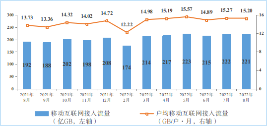 移動(dòng)互聯(lián)網(wǎng)流量較快增長(zhǎng)。1-8月份,移動(dòng)互聯(lián)網(wǎng)累計(jì)流量達(dá)1684億GB,同比增長(zhǎng)18.6%。截至8月末,移動(dòng)互聯(lián)網(wǎng)用戶數(shù)達(dá)14.59億戶,比上年末凈增4337萬(wàn)戶。8月當(dāng)月戶均移動(dòng)互聯(lián)網(wǎng)接入流量(DOU)達(dá)到15.2GB/戶·月,同比增長(zhǎng)10.7%,比上年底高0.48GB/戶·月。