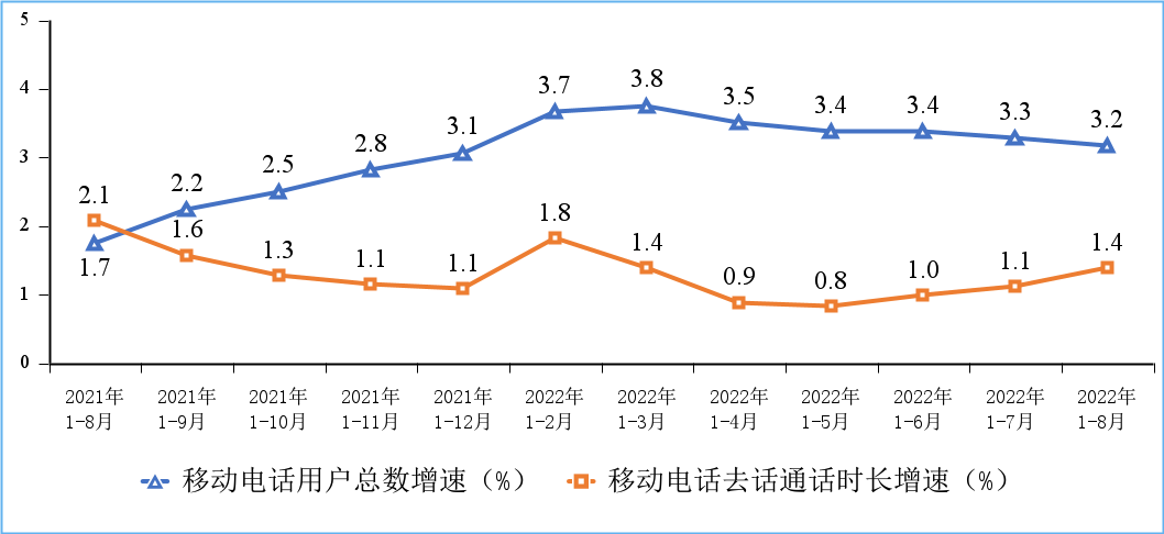 移動(dòng)電話通話量低速增長(zhǎng),移動(dòng)短信業(yè)務(wù)收入增速小幅提升。1-8月份,移動(dòng)電話去話通話時(shí)長(zhǎng)完成1.52萬(wàn)億分鐘,同比增長(zhǎng)1.4%;固定電話主叫通話時(shí)長(zhǎng)完成557.4億分鐘,同比下降11.1%。1-8月份,全國(guó)移動(dòng)短信業(yè)務(wù)量同比增長(zhǎng)1.7%,移動(dòng)短信業(yè)務(wù)收入同比增長(zhǎng)1.5%,增速較1-7月份分別回落0.4個(gè)和提升0.7個(gè)百分點(diǎn)。