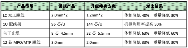 針對綜合光纖布線類產(chǎn)品而言,在數(shù)據(jù)中心機(jī)房空間一定的情況下,高密度布線將大大的提高空間利用效率,同時(shí)提高通風(fēng)效率,降低機(jī)房制冷能耗。光迅科技在現(xiàn)有的100G以太網(wǎng)光纖布線解決方案上面完成了瘦身方案的設(shè)計(jì)。該方案可以在保證產(chǎn)品質(zhì)量的前提下,滿足客戶更高空間密度的需求。瘦身方案包括1.2mm*2雙工LC跳線、1U144芯配線架、5.5mm32芯MPO主干和2.0mm12芯MPO/MTP跳線。