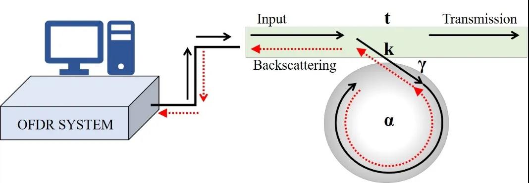 微環(huán)的尺寸較小,但是由于損耗較低,光會(huì)在微環(huán)的內(nèi)部環(huán)繞傳播很長(zhǎng)的時(shí)間,通過探測(cè)傳播過程中每個(gè)位置處的回波信號(hào),我們可以提取環(huán)內(nèi)的損耗性質(zhì)。測(cè)試原理如圖1所示。我們表征的微環(huán)是一個(gè)Ge摻雜型的二氧化硅微環(huán),半徑為1600μm,芯區(qū)的折射率為1.48,包層折射率為1.44左右,微環(huán)的界面尺寸為4μm*4μm。