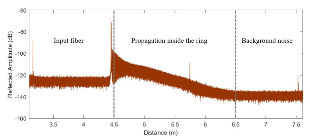 利用OCI系統(tǒng)的頻域表征模塊,我們得到了環(huán)內(nèi)傳播的諧振光距離域信息,也就是從4.5m到約6.5m的區(qū)域,由于我們的掃頻范圍包括了微腔的很多諧振頻率,所以這一段曲線實(shí)際上是所有諧振光貢獻(xiàn)的總和。