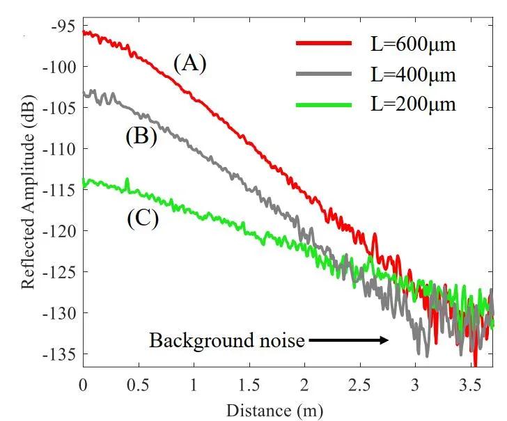 最后,對(duì)諧振腔的距離域譜線進(jìn)行了擬合測(cè)量。為了驗(yàn)證該表征技術(shù)的準(zhǔn)確性,我們還制備了3個(gè)耦合長(zhǎng)度(L)不同的微環(huán),分別被命名為微環(huán)A(L=600μm)、微環(huán)B(L=400μm)和微環(huán)C(L=200μm),它們的傳播損耗測(cè)量結(jié)果如圖4所示。