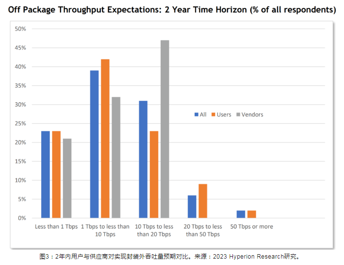 盡管用戶和供應(yīng)商都認(rèn)可光互連前景,但對其成熟時間預(yù)期有差異。圖3和圖4比較用戶和供應(yīng)商對2年內(nèi)和4-6年內(nèi)實現(xiàn)的封裝外吞吐量預(yù)期。用戶預(yù)計4-6年內(nèi)實現(xiàn)50 Tbps鏈接,而大多數(shù)供應(yīng)商認(rèn)為20-50 Tbps仍需5年以上。但兩者都看好光互連在不久后將迅速突破10 Tbps,相比當(dāng)前電互連提升10倍。要實現(xiàn)這一增益,標(biāo)準(zhǔn)和生態(tài)必須進化支持光集成。Ayar Labs通過提供處理器封裝內(nèi)的光輸入輸出“chiplets”,旨在加速商業(yè)采用。通過互操作光組件避免專有接口,平滑光互連發(fā)展之路。