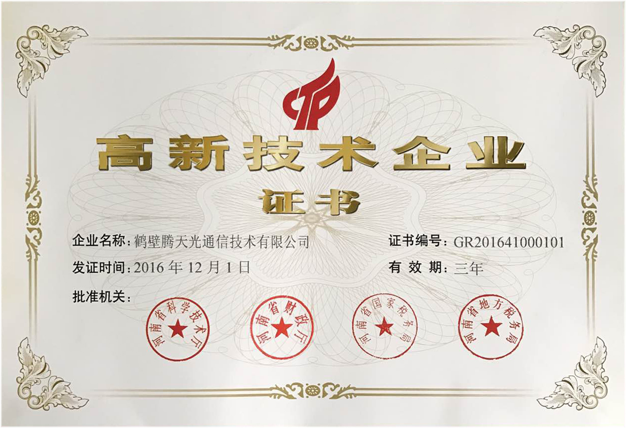 ICCSZ訊 2016年12月1日,河南省科學技術廳、河南省財政廳、河南省國家稅務局、河南省地方稅務局正式批準授予鶴壁騰天光通信技術有限公司 “國家高新技術企業(yè)”認定證書。證書編號GR201641000101,發(fā)證日期為2016年12月1日,有效期三年。