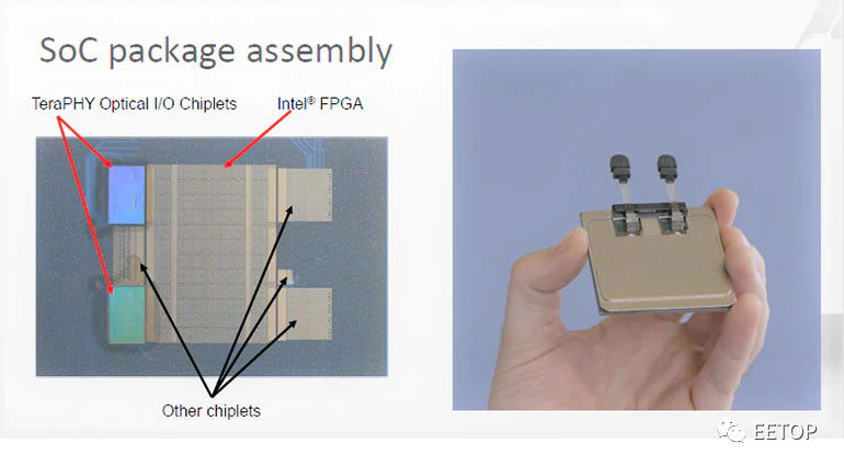 英特爾/ Ayar項目尚未實現(xiàn)這些目標,但確實朝著這些目標邁出了重要一步。在2020年光纖會議(OFC)上的線上演示中,Ayar展示了其TeraPHY光學芯片技術,該技術已集成到通常使用銅互連的改進型商用IC(英特爾Stratix 10 FPGA)中(圖2)。