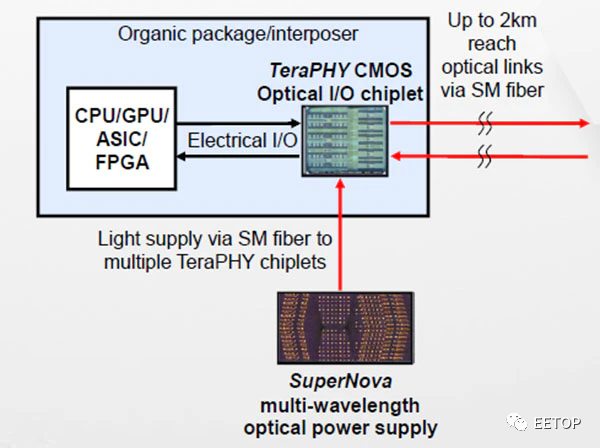 這是一種非常高級的光學I / O系統(tǒng)架構,圖片顯示了主要組件的互連