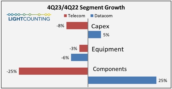 LC表示,這不是光通信行業(yè)第一次顯示出電信和數據通信板塊之間的表現差異,如下圖所示。云計算公司繼續(xù)增加支出,而電信服務提供商則在努力維持其網絡的運行。如果沒有2023年第四季度向微軟和亞馬遜銷售的400ZR/ZR+模塊的增長,包括DWDM、FTTx和無線前傳收發(fā)器在內的電信器件的銷售額下降幅度會更大。