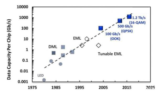 除此之外,最重要的一點就是光通信芯片數(shù)據(jù)容量的增速可滿足數(shù)據(jù)指數(shù)級增長需求。在過去這些年,光通信的數(shù)據(jù)處理能力呈指數(shù)級增長,平均每2.2年翻一番,每十年提高一個數(shù)量級。