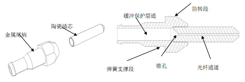 陶瓷插芯內(nèi)孔固定125um光纖,金屬尾柄內(nèi)孔用于固定光纖緩沖保護(hù)層。陶瓷插芯后尾端為錐孔結(jié)構(gòu),方便光纖穿入。
