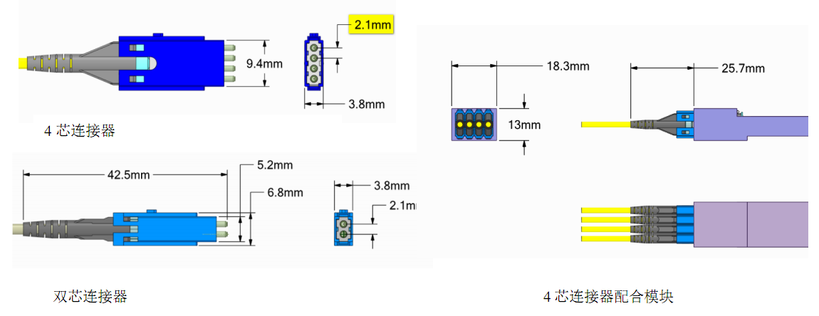理論上在雙芯連接器和多芯連接器的整列排布方向上的間距尺寸可以達(dá)到陶瓷套筒外徑尺寸(陶瓷套筒外徑尺寸一般為1.62mm),但各陶瓷套筒之間需要被隔離,并且連接器對(duì)接的核心部件在適配器需要一定的浮動(dòng)間隙,以具備更好的防側(cè)拉性能,所以新連接器的間距尺寸定為2.1mm。