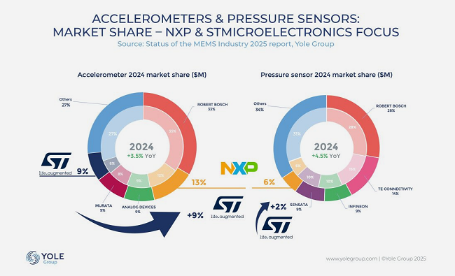 Yole Group MEMS與傳感領(lǐng)域高級(jí)技術(shù)與市場(chǎng)分析師Pierre-Marie Visse分析指出:“根據(jù)我們最新發(fā)布的報(bào)告,在加速度計(jì)領(lǐng)域,恩智浦以13%的市場(chǎng)份額位居第二,意法半導(dǎo)體以9%的份額位居第五。通過(guò)此次收購(gòu),意法半導(dǎo)體將成為僅次于博世的加速度計(jì)生態(tài)系統(tǒng)第二大廠商。在壓力傳感器領(lǐng)域,恩智浦以6%的市場(chǎng)份額排名第五,而意法半導(dǎo)體占據(jù)約2%的份額。收購(gòu)將增強(qiáng)意法半導(dǎo)體在壓力傳感器生態(tài)系統(tǒng)中的地位,其規(guī)模將接近森薩塔(Sensata)或英飛凌科技(Infineon Technologies)。”