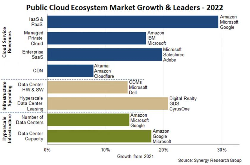 ICC訊 1月25日,Synergy Research Group在其最新報告中指出,在公有云和基礎(chǔ)架構(gòu)市場,2022年運營商和供應(yīng)商收入達(dá)到5440億美元,比2021年增長21%。其中,增長最快的是基礎(chǔ)架構(gòu)即服務(wù)(IaaS)和平臺即服務(wù)(PaaS),盡管受美元走強等多重因素影響,但這些服務(wù)的年收入仍增長了29%,總計超過1950億美元。私有云托管服務(wù)、企業(yè)軟件即服務(wù)(SaaS)和內(nèi)容交付網(wǎng)絡(luò)(CDN)則進一步貢獻(xiàn)了2290億美元的營業(yè)收入,自2021年以來增長了約19%。此外,公有云提供商在建設(shè)、租賃和裝備其數(shù)據(jù)中心基礎(chǔ)設(shè)施方面花費了1200億美元,比前一年增長了13%。