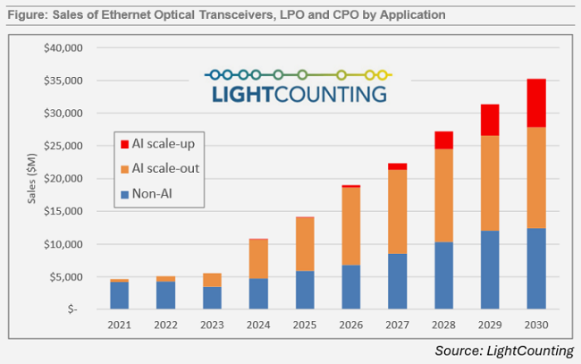 ICC訊 2025年7月,LightCounting發(fā)布《云數(shù)據(jù)中心光學(xué)器件報(bào)告》指出,云公司在數(shù)據(jù)中心及網(wǎng)絡(luò)基礎(chǔ)設(shè)施上的投資,為光模塊市場創(chuàng)造了一個(gè)全新且高度活躍的細(xì)分領(lǐng)域。2023-2025年AI開發(fā)的爆發(fā)式增長推動(dòng)了光連接需求激增,這一趨勢將支撐市場持續(xù)擴(kuò)張至2030年。