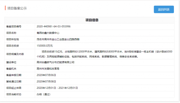 ICC訊 協(xié)鑫能科近日公告,公司控股子公司高州協(xié)鑫燃?xì)夥植际侥茉从邢薰居?jì)劃投建的“粵西協(xié)鑫大數(shù)據(jù)中心”項(xiàng)目于2020年7月8日取得高州市發(fā)展和改革局出具的《廣東省企業(yè)投資項(xiàng)目備案證》。