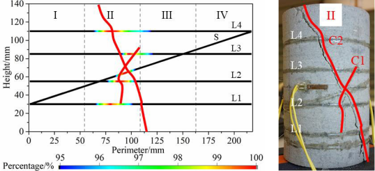圖5. 砂巖表面應(yīng)變集中分布與最終破壞形態(tài)的對比(展開圖)