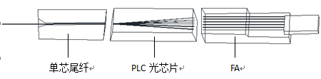 PLC光分芯片是通過(guò)特殊的制造工藝,在一種基板材料上生成一種一入多出的樹枝狀光波導(dǎo)通道,當(dāng)光信號(hào)從輸出端進(jìn)入時(shí),會(huì)沿著光波導(dǎo)的路徑,分成多束光信號(hào)從輸出端射出,在PLC光芯片的輸入和輸出端耦合連接上FA(光纖陣列)和光纖端頭后,就可以完成正常的分光功能了。PLC光芯片的工作原理如圖1所示: