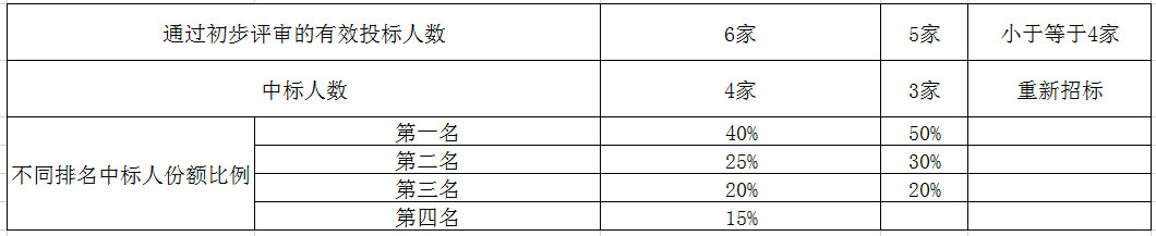 通過(guò)初步評(píng)審的有效投標(biāo)人小于7家時(shí),中標(biāo)人數(shù)量及對(duì)應(yīng)的份額如下: