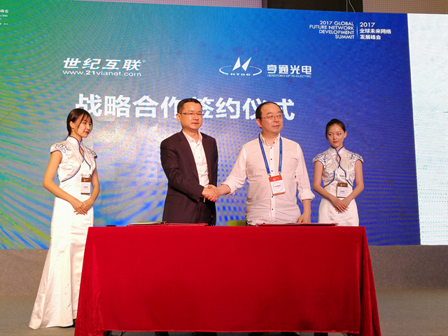 在2017全球未來網(wǎng)絡(luò)發(fā)展峰會(huì)期間,亨通光電與世紀(jì)互聯(lián)舉辦戰(zhàn)略合作簽約儀式,亨通集團(tuán)執(zhí)行總裁、亨通光電董事長(zhǎng)錢建林與世紀(jì)互聯(lián)創(chuàng)始人、董事長(zhǎng)陳升等雙方高管出席了簽約儀式。