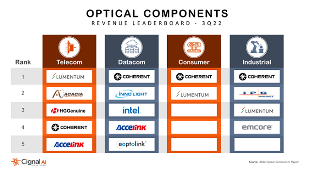 ICC訊(編譯:Nina)根據(jù)研究公司Cignal AI最新的光器件報(bào)告,數(shù)據(jù)通信光器件收入在經(jīng)歷了兩個(gè)季度的下滑之后,2022年第三季度在400GbE光模塊的驅(qū)動(dòng)下實(shí)現(xiàn)了穩(wěn)健增長(zhǎng)。該分析公司表示,旭創(chuàng)和Coherent高意(以前為II-VI)通過擴(kuò)大超大規(guī)模(Hyperscale)應(yīng)用產(chǎn)品的出貨量推動(dòng)了增長(zhǎng)。電信器件供應(yīng)商方面,領(lǐng)先的供應(yīng)商仍是Lumentum,其收入同比增長(zhǎng)了6%。