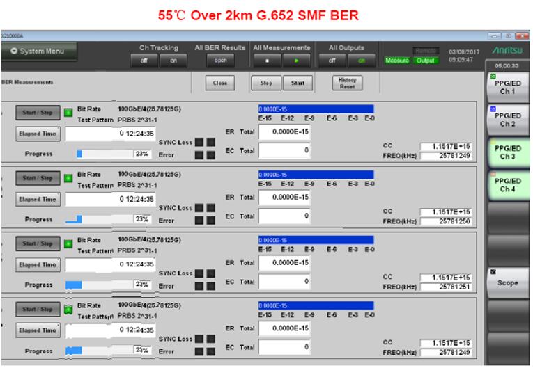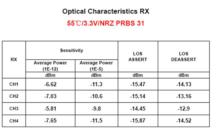 易飛揚(yáng)的QSFP28 PSM4在三溫(-5°C/25°C /55°C)環(huán)境下均表現(xiàn)出良好優(yōu)越的性能,四通道均勻性和一致性都滿足設(shè)計(jì)指標(biāo),三溫情況下四路光眼圖裕量(MARGIN)均高于15%,靈敏度優(yōu)于協(xié)議約束的-9.5dbm(1E-5).