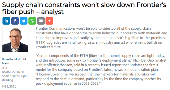 ICC訊(編譯:Nina)一位仍然看好Frontier未來的行業(yè)分析師表示,Frontier Communications將無法避開困擾電信行業(yè)的所有供應鏈限制,但等到該電信公司的大型光纖到戶(FTTP)部署全面開展時,材料和勞動力短缺的情況應該會顯著改善。