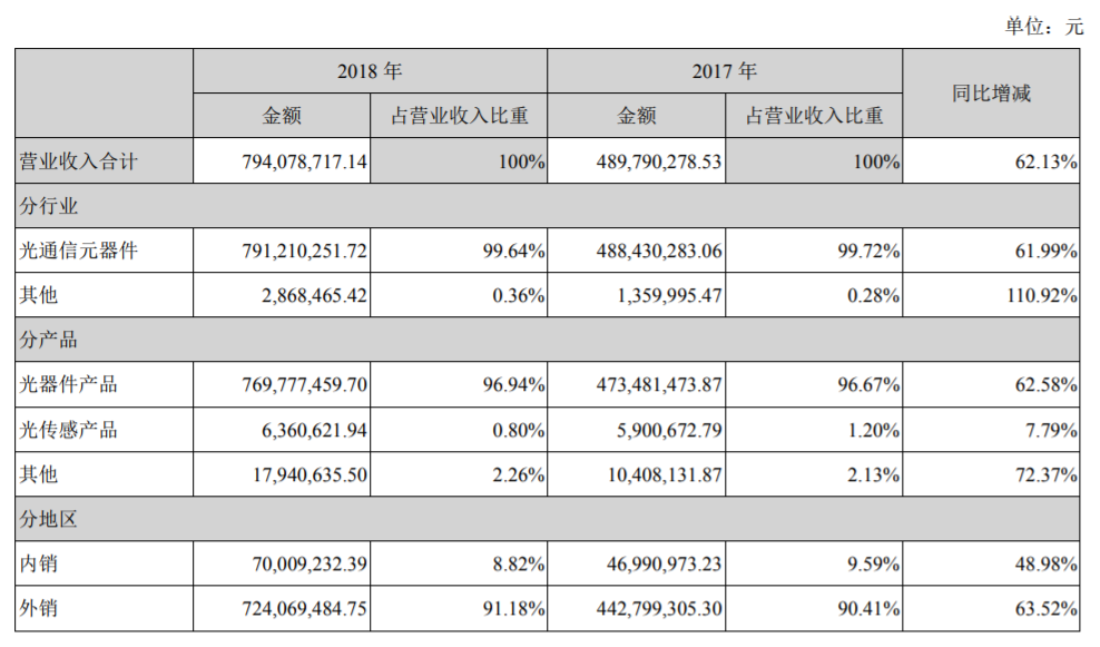 太辰光以陶瓷插芯這個光纖定位的核心元件進入光通信領域,跟隨著光通信網(wǎng)絡建設的步伐,持續(xù)加大在光器件領域技術與產(chǎn)品的開發(fā)投入。盡管陶瓷插芯的銷售占比已逐漸下降到10%左右,但公司2018年業(yè)績依然保持較大增長,這與前幾年的堅持技術與產(chǎn)品開發(fā)投入密切相關,其中對高密度連接與各種器件集成功能模塊的開發(fā)取得明顯效果,其銷售獲得大比率的增長。