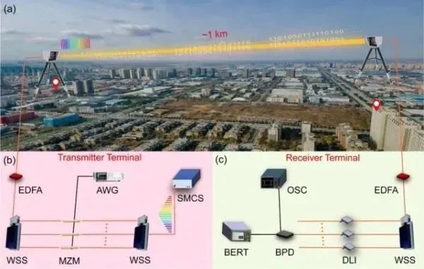 建立大容量、長傳輸距離FSOC系統(tǒng)是當(dāng)下領(lǐng)域內(nèi)的研究熱點(diǎn)。片上微腔孤子光頻梳(SMC)具有超高重復(fù)頻率,且各個(gè)梳齒具有嚴(yán)格相等的頻率間隔,是波分復(fù)用FSOC系統(tǒng)的理想激光光源。西安光機(jī)所研究員謝小平與光子網(wǎng)絡(luò)技術(shù)研究室研究員汪偉團(tuán)隊(duì)、瞬態(tài)光學(xué)與光子技術(shù)國家重點(diǎn)實(shí)驗(yàn)室研究員張文富和副研究員王偉強(qiáng)團(tuán)隊(duì)合作,利用新興的微腔孤子光頻梳代替?zhèn)鹘y(tǒng)的半導(dǎo)體可調(diào)諧激光陣列作為多載波光源,使用10 Gbit/s差分相移鍵控調(diào)制信號,在相距1 km的自由空間光通信鏈路上實(shí)現(xiàn)了總速率為1.02 Tbps的并行數(shù)據(jù)傳輸。該工作將片上微腔孤子光頻梳作為多波長光源應(yīng)用于自由空間光通信研究,對提升自由空間光通信的容量和解決自由空間光通信的體積重量和功耗(SWaP)問題具有重要意義,并為未來大容量、長距離自由空間光通信發(fā)展提供了新途徑。