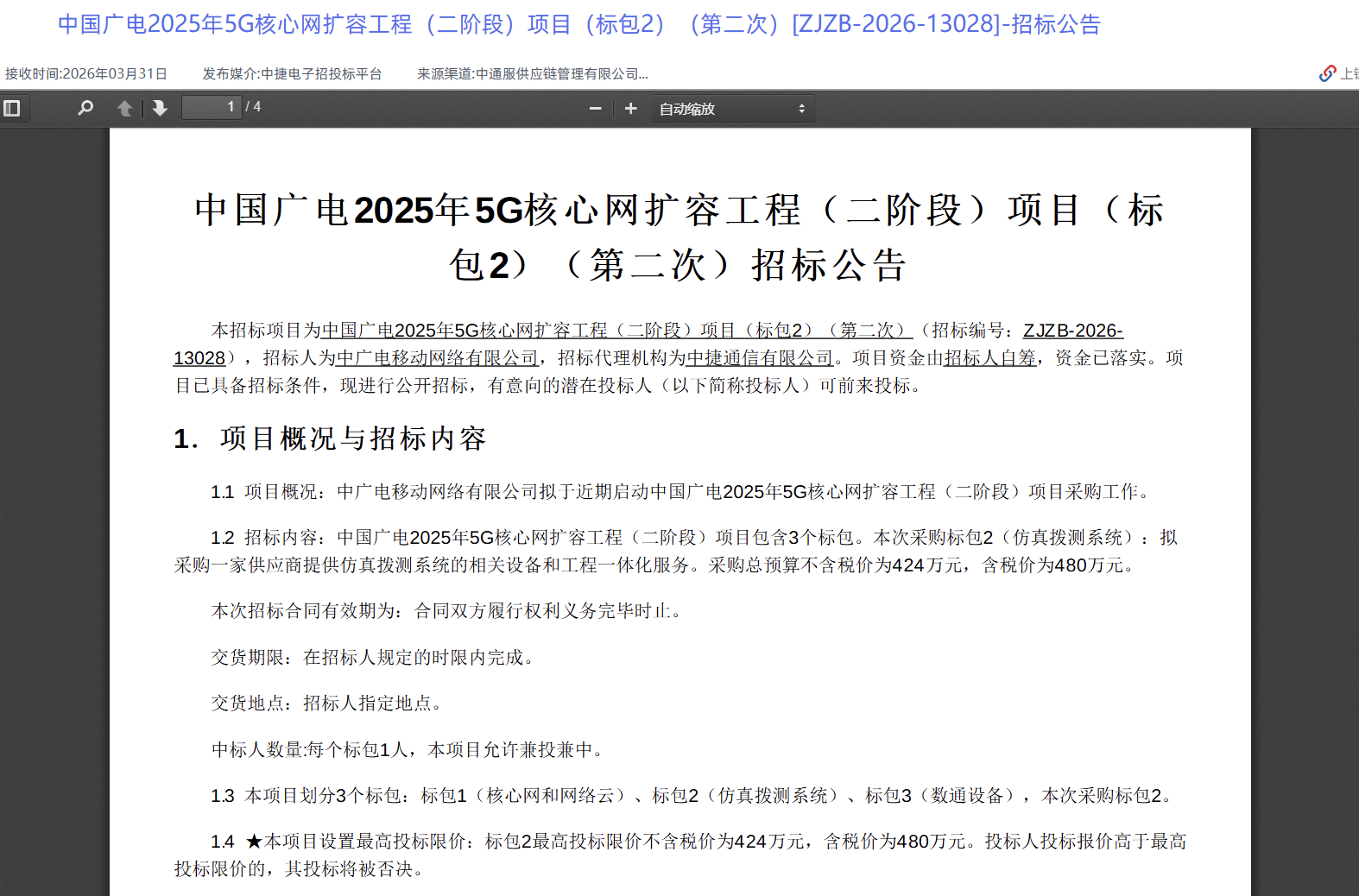ICC訊 3月31日,中廣電移動網(wǎng)絡(luò)有限公司發(fā)布公告,宣布中國廣電2025年5G核心網(wǎng)擴容工程(二階段)”標(biāo)包2和標(biāo)包3采購失敗,原因均為參與項目的投標(biāo)人不足三家,不具備法定開標(biāo)條件。