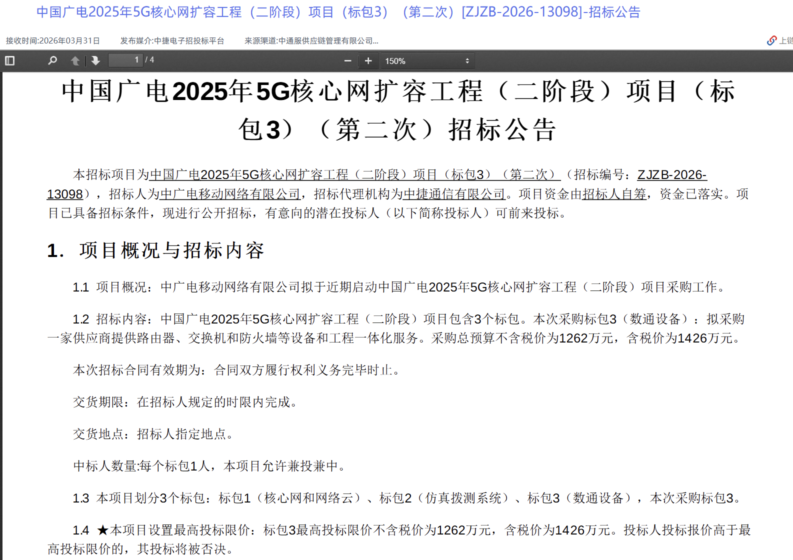 標(biāo)包3(數(shù)通設(shè)備)擬采購一家供應(yīng)商提供路由器、交換機和防火墻等設(shè)備和工程一體化服務(wù),采購總預(yù)算不含稅價為1262萬元,含稅為1426萬元。