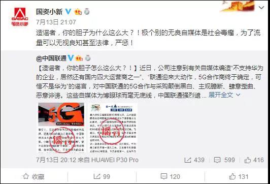 對此中國聯(lián)通7月13日官方微博@中國聯(lián)通 發(fā)布聲明,自媒體對中國聯(lián)通5G合作與采購顛倒黑白、主觀臆斷、肆意歪曲、惡意誹謗。這些自媒體為博眼球而毫無底線,中國聯(lián)通強(qiáng)烈譴責(zé)這種居心不良、憑空捏造、濫扣帽子、煽動(dòng)公眾情緒、誤導(dǎo)社會(huì)輿論、極度不負(fù)責(zé)任的造謠污蔑行為,并保留通過法律手段維護(hù)公司合法權(quán)益的權(quán)利。