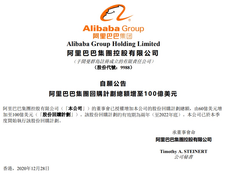 據(jù)了解,該股份回購(gòu)計(jì)劃的有效期為兩年(至2022年底)。阿里巴巴已于本季度開始執(zhí)行該股份回購(gòu)計(jì)劃。