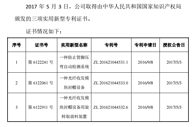 作為一家成立不到六年便已在新三板掛牌的公司,瑞谷光網(wǎng)在提供優(yōu)質(zhì)客戶服務(wù)的同時(shí),通過(guò)產(chǎn)品自主研發(fā)不斷為自身注入新能量,使公司在發(fā)展的過(guò)程中每一步都走得穩(wěn)實(shí)有力,打固根基。2017年5月3日,瑞谷光網(wǎng)剛獲得國(guó)家知識(shí)產(chǎn)權(quán)局頒發(fā)的三項(xiàng)實(shí)用新型專利認(rèn)定。