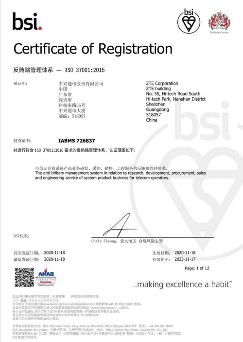ICC訊 11月,中興通訊通過(guò)反賄賂管理體系ISO 37001:2016認(rèn)證并獲得相關(guān)證書(shū),成為國(guó)內(nèi)首家獲得由BSI英國(guó)標(biāo)準(zhǔn)協(xié)會(huì)認(rèn)證并帶有ANAB認(rèn)可的(美國(guó)國(guó)家標(biāo)準(zhǔn)協(xié)會(huì)—美國(guó)質(zhì)量學(xué)會(huì)認(rèn)證機(jī)構(gòu)認(rèn)可委員會(huì),ANSI-ASQ National Accreditation Board)ISO 37001證書(shū)的中國(guó)企業(yè)。此次認(rèn)證的順利通過(guò),是中興通訊管理層重視、持續(xù)資源投入和全員參與合規(guī)的重要成果,標(biāo)志著公司在反賄賂合規(guī)領(lǐng)域已經(jīng)躋身國(guó)際一流的企業(yè)行列。