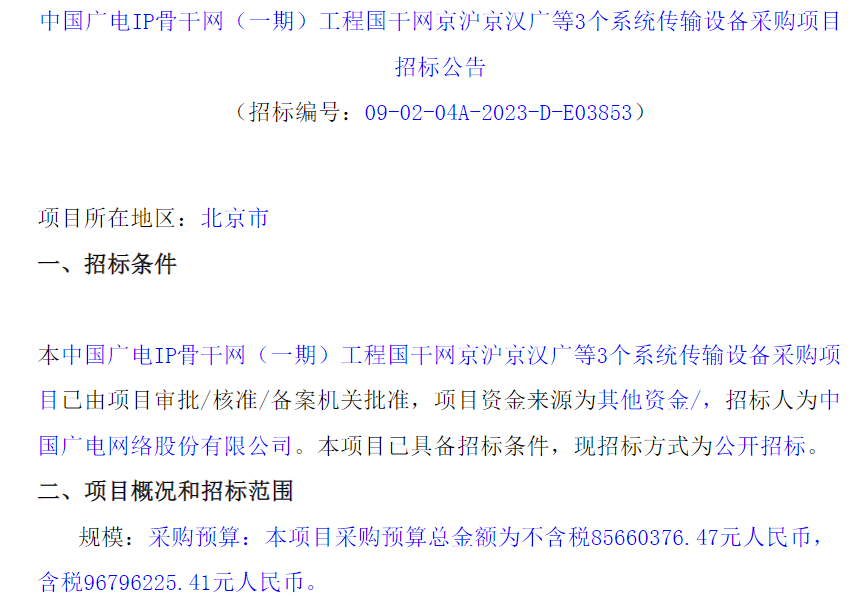 DVBCN注意到,中國(guó)廣電網(wǎng)絡(luò)股份有限公司在今天(3月9日)發(fā)出了一系列的中國(guó)廣電IP骨干網(wǎng)(一期)工程國(guó)干網(wǎng)部分相關(guān)系統(tǒng)傳輸設(shè)備的招標(biāo)公告,同時(shí)還有一項(xiàng)價(jià)值1327.5萬元的整體工程監(jiān)理服務(wù)項(xiàng)目。
