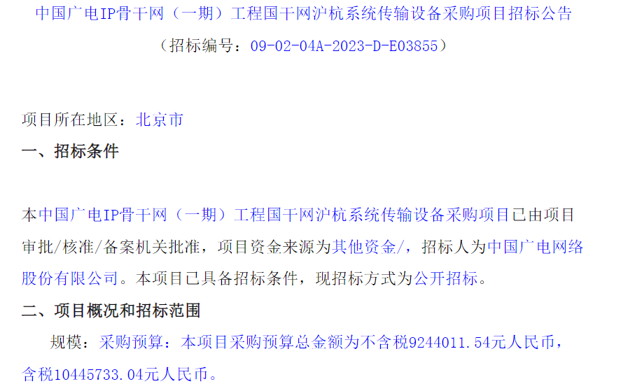 而根據(jù)中國(guó)廣電公示的系列標(biāo)書信息,中國(guó)廣電IP骨干網(wǎng)(一期)項(xiàng)目的總投資預(yù)估為9.48億元(含稅),先前已經(jīng)進(jìn)行了工程勘察設(shè)計(jì)服務(wù)、工程監(jiān)理服務(wù)等項(xiàng)目招標(biāo),二者合計(jì)約有近4千萬的金額,因此還有近3億元的具體項(xiàng)目即將陸續(xù)啟動(dòng)。