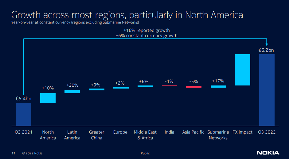 按地區(qū)劃分,諾基亞2022年三季度在亞太地區(qū)收入6.38億歐元,與去年同期基本持平;歐洲地區(qū)收入15.33億歐元,同比增長4%;大中華地區(qū)收入4.15億歐元,同比增長18%;印度地區(qū)收入2.81億歐元,同比增長12%;拉丁美洲地區(qū)收入3.34億歐元,同比增長40%;中東和非洲地區(qū)收入4.82億歐元,同比增長15%;北美地區(qū)收入22.75億歐元,同比增長28%。
