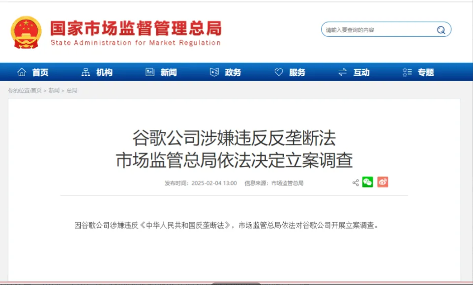 ICC訊 2025年2月4日,中國(guó)國(guó)家市場(chǎng)監(jiān)督管理總局發(fā)布公告,正式對(duì)谷歌公司立案調(diào)查,原因是其涉嫌違反《中華人民共和國(guó)反壟斷法》。此次調(diào)查在全球科技行業(yè)引發(fā)了廣泛關(guān)注,標(biāo)志著中國(guó)在維護(hù)市場(chǎng)公平競(jìng)爭(zhēng)和保護(hù)消費(fèi)者權(quán)益方面邁出了重要一步。