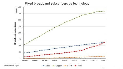 Point Topic相關負責人表示,對于全球網(wǎng)民來說,銅線(電話線)仍然是主導性的寬帶網(wǎng)絡,不過寬帶技術(shù)已經(jīng)出現(xiàn)了遷移的趨勢,隨著消費者愿意為更高速的寬帶支付費用,光纖寬帶和光纖混合同軸的方式越來越普及。