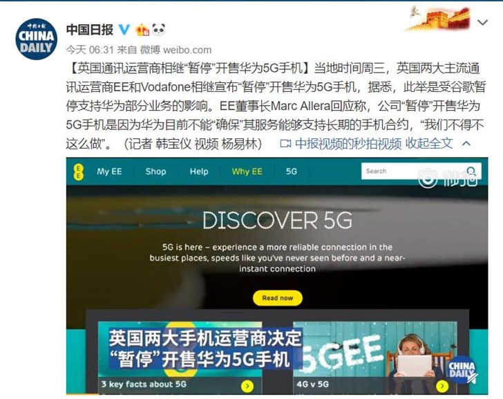 ICCSZ訊 據(jù)中國日報消息,當(dāng)?shù)貢r間周三,英國兩大主流通訊運營商EE和Vodafone相繼宣布“暫?!遍_售華為5G手機(jī),據(jù)悉,此舉是受谷歌暫停支持華為部分業(yè)務(wù)的影響。EE董事長Marc Allera回應(yīng)稱,公司“暫?!遍_售華為5G手機(jī)是因為華為目前不能“確?!逼浞?wù)能夠支持長期的手機(jī)合約,“我們不得不這么做”。