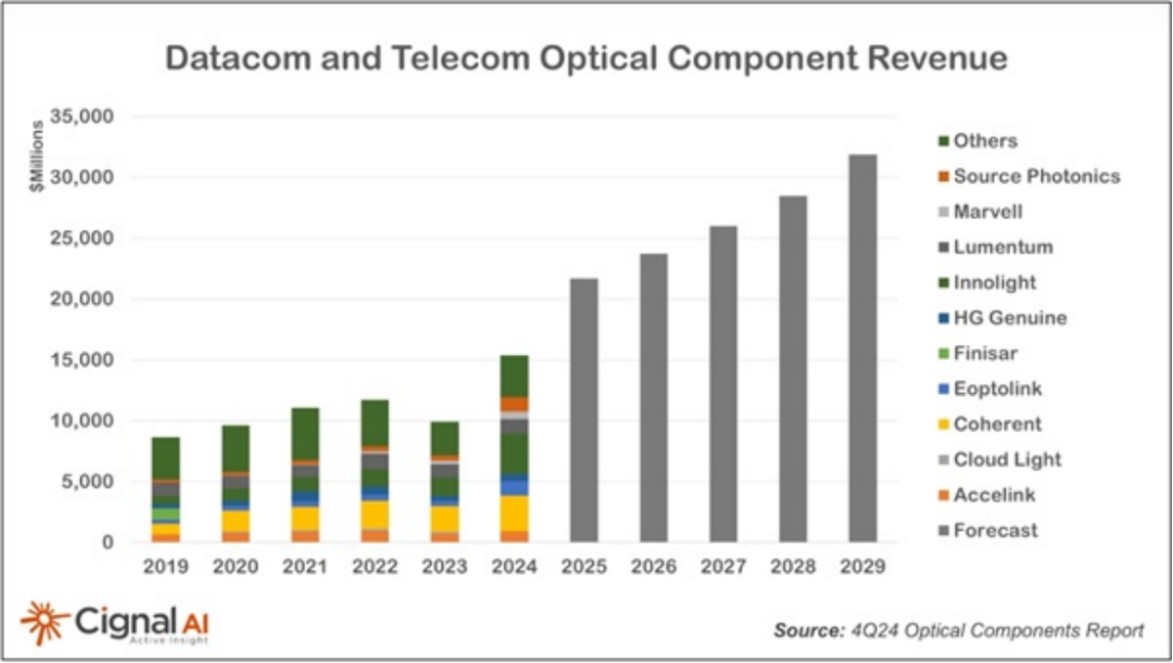 另外值得注意的是,國外光器件領先企業(yè)Coherent最新財報2025財年第三季度顯示:通信市場營收增長2.81億美元(46%),主要得益于AI數(shù)據(jù)中心相關收入的持續(xù)增長以及電信收入的連續(xù)第三個季度增長,達成了創(chuàng)紀錄的數(shù)據(jù)中心收發(fā)器銷售額。這一成就主要得益于AI數(shù)據(jù)中心需求的強勁推動。800G收發(fā)器不僅在市場上獲得了更多的客戶采用,而且其生產(chǎn)量也在穩(wěn)步增加。