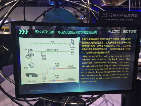 光纖傳感市場近年發(fā)展迅速,亨通光電展出其領(lǐng)先業(yè)界的海底光電復(fù)合纜系統(tǒng)解決方案,隆重介紹海底光電復(fù)合纜實時監(jiān)測系統(tǒng),該系統(tǒng)利用光電復(fù)合纜內(nèi)置的光纖作為傳感器,并結(jié)合先進(jìn)的分布式光纖測溫技術(shù),實時獲得電纜沿線每一點的溫度實時信息,避免重大事故發(fā)生。另外,在獲得電纜分布式溫度數(shù)據(jù)的基礎(chǔ)上,結(jié)合實時載流量分析軟件,為電纜動態(tài)增容提供依據(jù)。