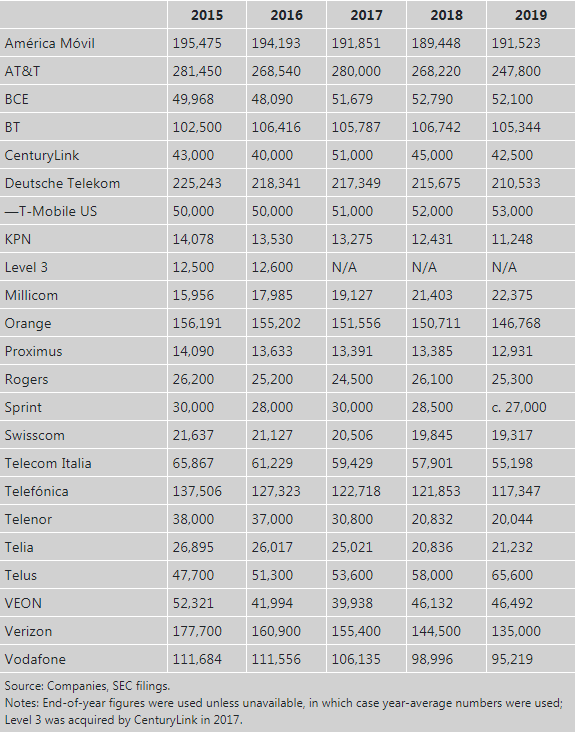 過去幾年里,LR數(shù)據(jù)庫中的20家電信運營商裁員數(shù)萬人,其中相對較少的幾家是因為資產(chǎn)剝離等導(dǎo)致的。從2015年至2019年間,這些公司裁員總數(shù)約17.5萬人,超過員工總數(shù)的9%。