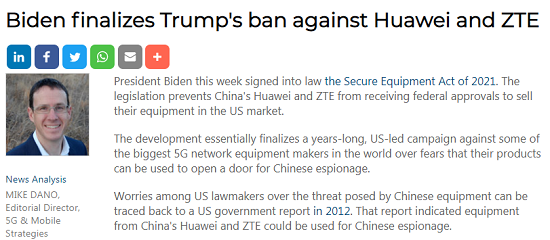 ICC訊(編譯:Nina)外媒Light Reading消息--上周,美國拜登總統(tǒng)簽署了《2021年安全設(shè)備法案》(The Secure Equipment Act of 2021)。該法案阻止中國的華為和中興通訊獲得聯(lián)邦批準(zhǔn)在美國市場銷售其設(shè)備。