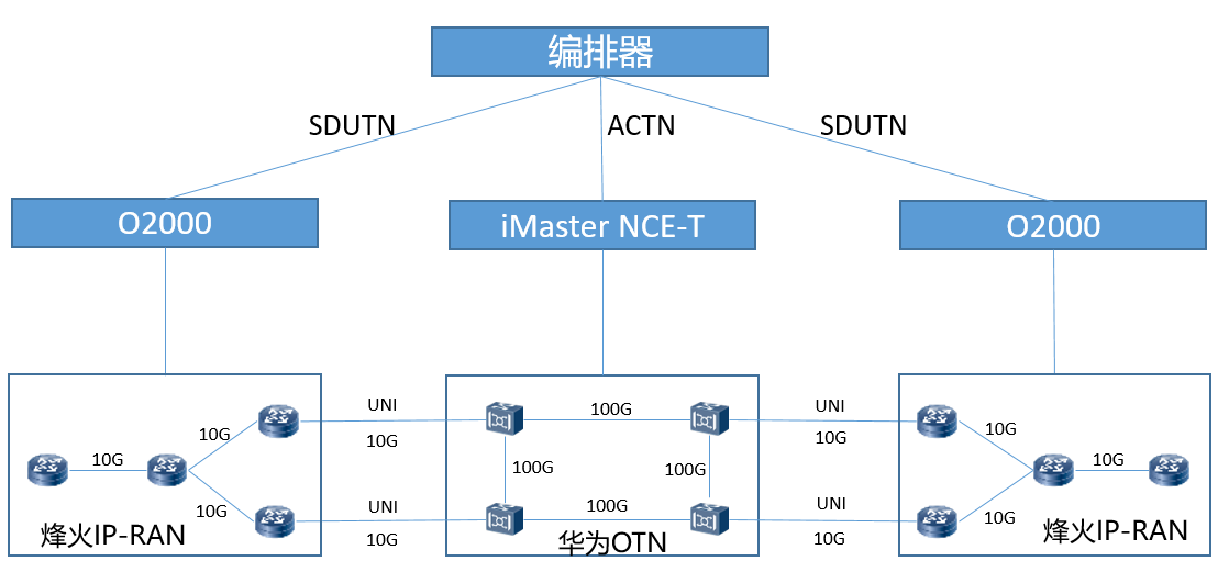 本次演示采用兩層SDN管控系統(tǒng)架構,下層由烽火提供IP-RAN設備及其網(wǎng)管系統(tǒng)O2000,華為提供OTN傳輸設備及其管控系統(tǒng)iMaster NCE(Network cloud Engine)-T,組合提供IP-RAN&OTN跨專業(yè)業(yè)務;上層使用中國聯(lián)通研究院自主開發(fā)的端到端云網(wǎng)編排器系統(tǒng)(以下簡稱編排器)進行協(xié)同管理,驗證了跨專業(yè)場景下拓撲呈現(xiàn)、資源統(tǒng)一管理、端到端業(yè)務配置下發(fā)、端到端保護業(yè)務配置下發(fā)及倒換測試等主要功能。