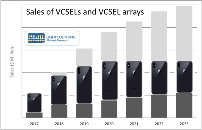 ICCSZ訊(編譯:Nina)2017年對于VCSEL陣列制造商來說是關(guān)鍵的一年。iPhone X采用VCSEL陣列實(shí)現(xiàn)人臉識別,為VCSEL市場開辟了一個(gè)全新的領(lǐng)域。2017年,用于iPhone X的VCSEL陣列銷售超過2億美元--與VCSEL供應(yīng)商來自全球光通信市場的收入相當(dāng)。