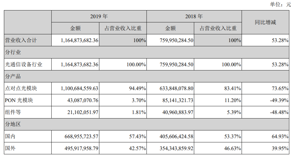 分產(chǎn)品來看,點對點光模塊營收約11億元,同比增長73.65%,占總營收94.49%;PON光模塊營收4308.7萬元,同比下降49.39%,占總營收3.7%;組件等產(chǎn)品營收2110.2萬元,同比下降48.48%,占總營收1.81%。